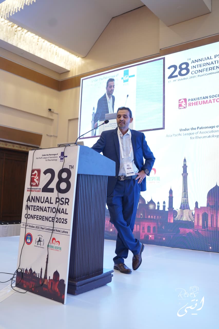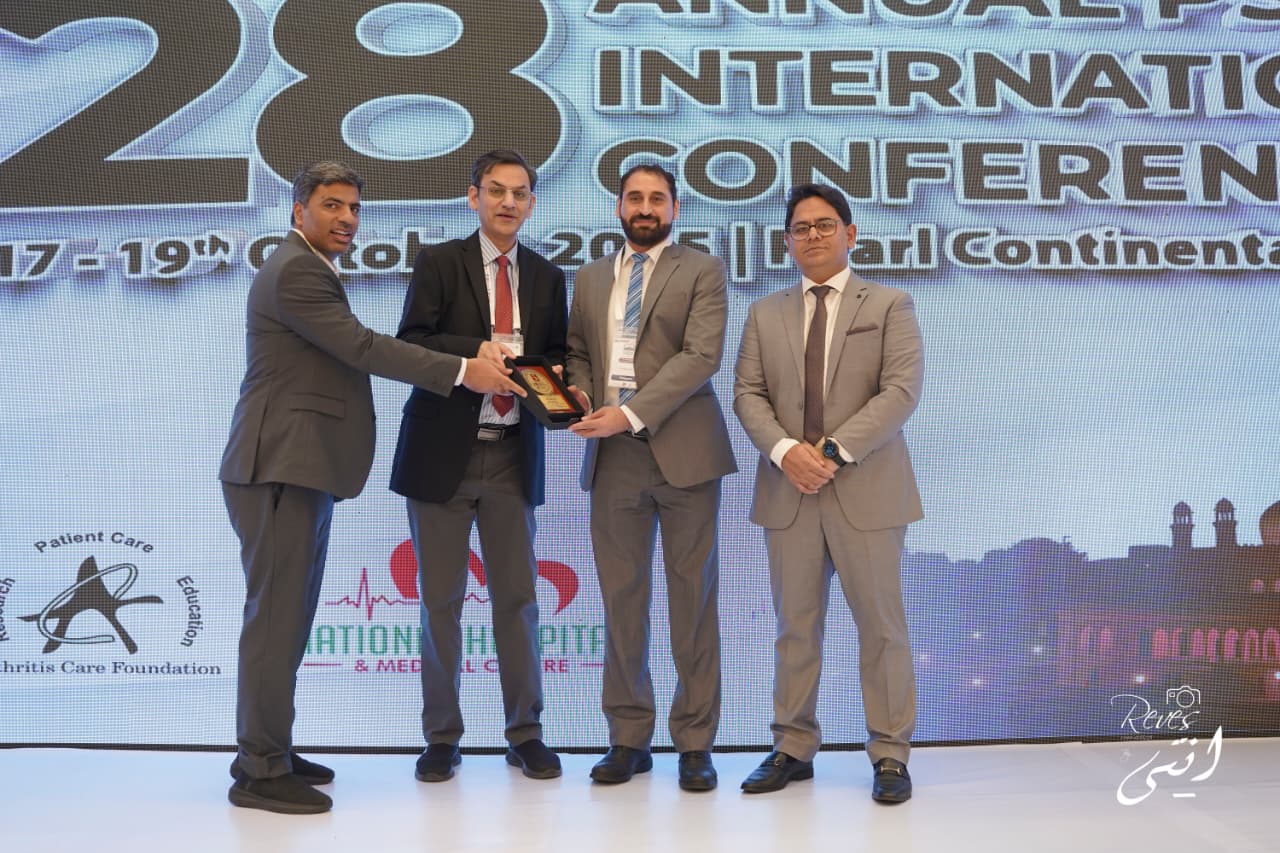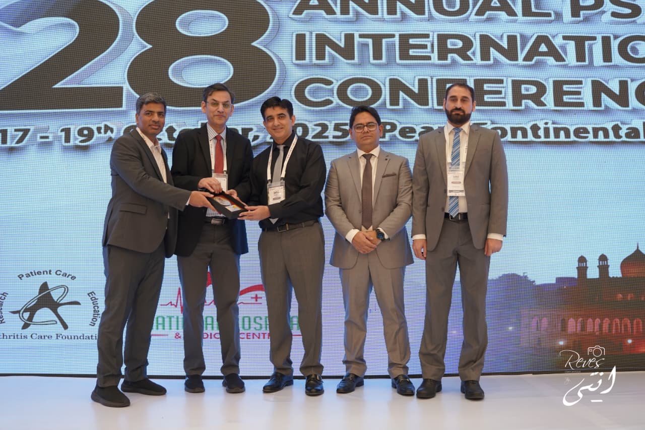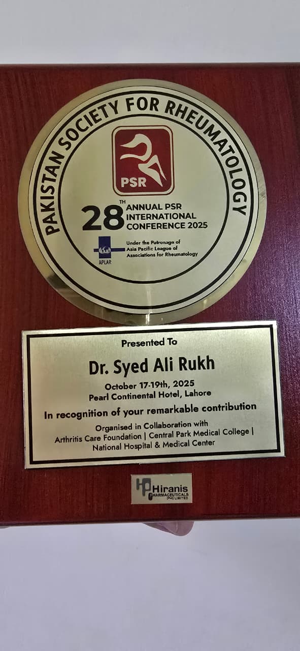 Dr. Syed Ali Rukh was honored at the 28th Annual PSR International Conference 2025, held from October 17–19 at Pearl Continental Hotel, Lahore, in recognition of his remarkable contribution to rheumatology.